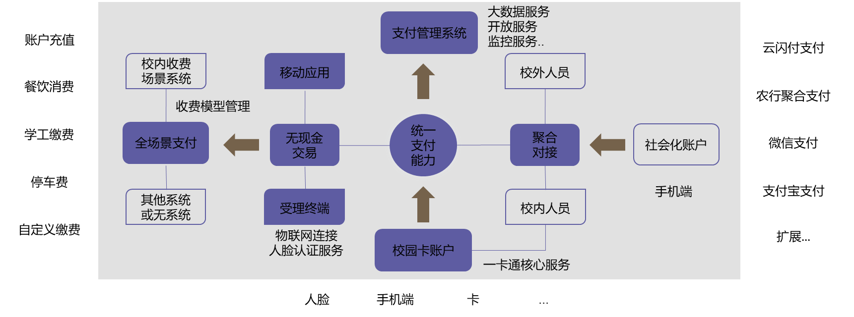 随着移动支付与人脸支付等技术的普及,为了切实践行“以人为本”的智慧校园建设理念,学校亟需从顶层设计满足“全场景支付”、“高扩展”、“高用户体验”、“智能化”要求的支付业务主题的信息化平台。 面向校内外用户,以支付场景建设为核心,秉持“融合、物联、创新”原则,充分利用多元化支付渠道、多样化支付介质(含人脸)、在线交易与双离线技术、多收费场景灵活扩展等技术手段,覆盖充值、缴费、消费、收款等校园全支付场景,建设学校统一的支付体系,打造智慧支付业务中台。