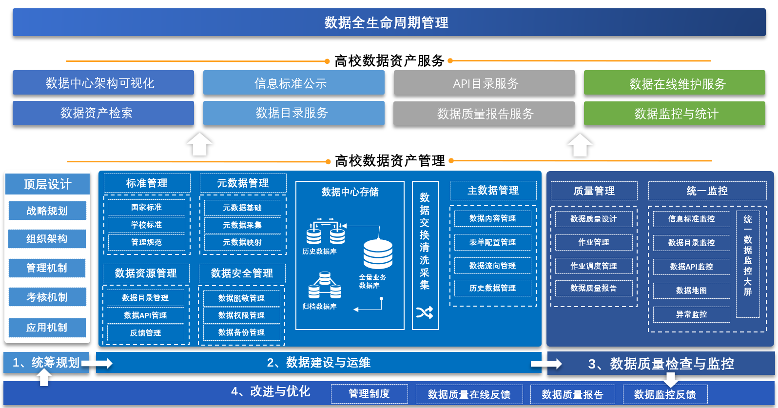 而目前的高校,数据中心建设存在的大量的问题,难以满足高校在决策、管理、服务、流程优化、业务创新等多方面的要求。为此,急需进行全面的数据治理。通过数据治理可重复的迭代过程,螺旋式上升模型,实现数据资产的不断沉淀、积累和质量的持续提升。 高校数据中台的建设遵循技术与管理的相结合,贯穿在数据管理的过程中。建立科学有效的数据中台体系,对学校各业务系统和数据中心的数据质量实施全程、全域和全员的管理。将数据质量管理以制度化、规范化的方式落实到数据采集、存储、清洗、生成、转化、传递和使用的各个过程环节之中,将会成为学校信息化建设的一项重要工作。