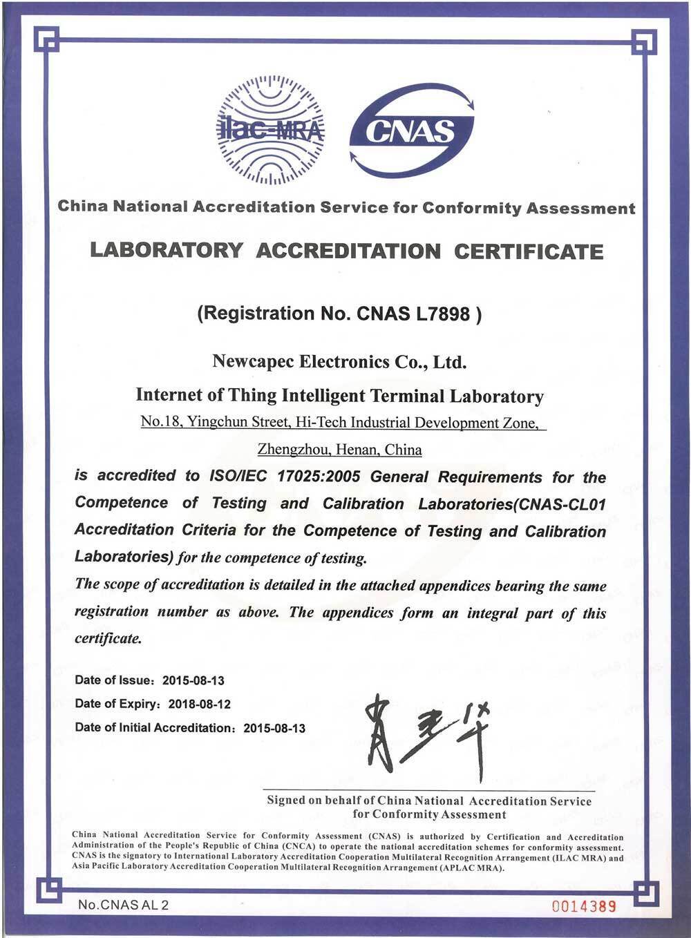 金年会电子股份有限公司物联网智能终端实验室于2015年8月正式通过CNAS认可,取得CNAS认可证书,证书编号为CNAS L7898。这表明我公司实验室具备按照相应认可准则开展检测......