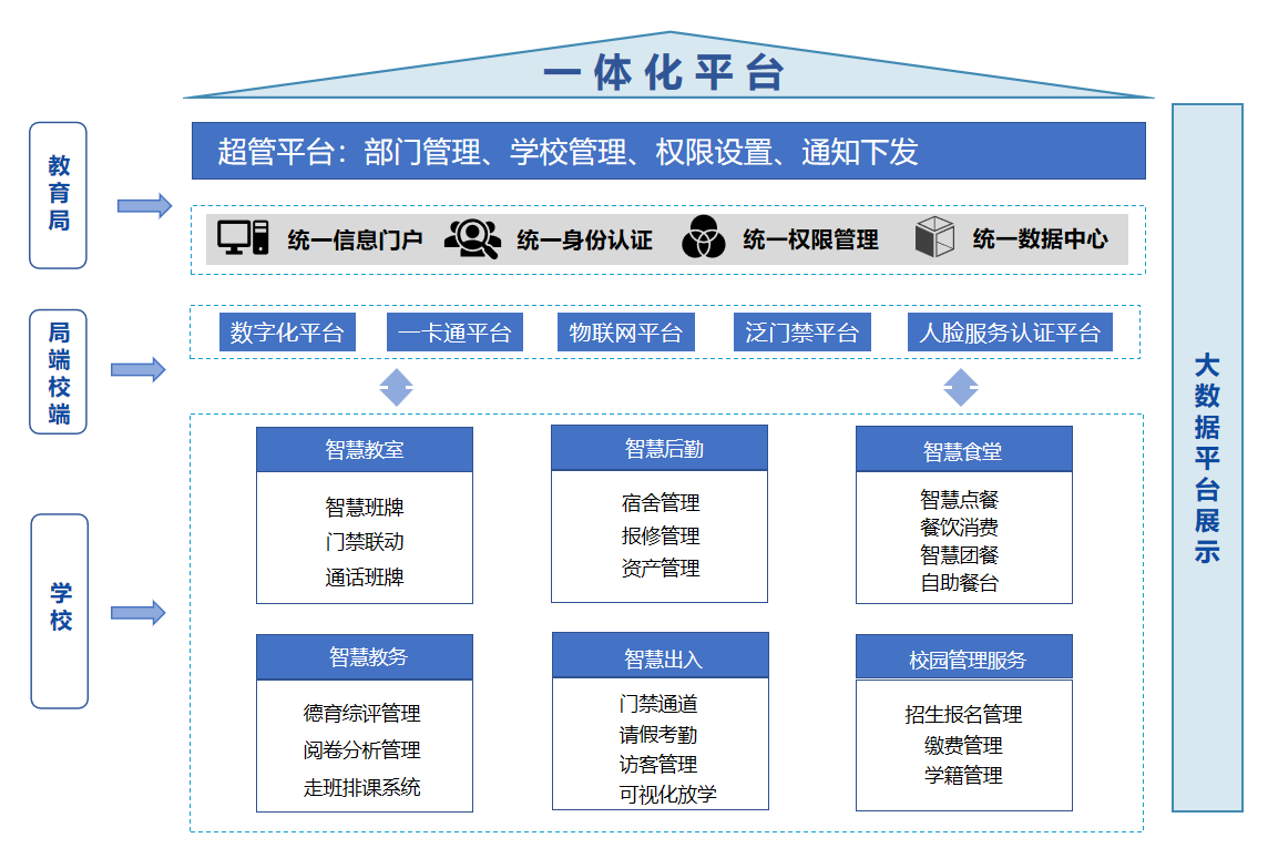 一体化综合管理平台贯穿“场景+平台”的产品理念,即基于一体化核心平台,搭建包含师生信息管理、身份权限管理、日常校务办公、后勤服务、教务管理、教学教研、家校互通等多种场景业务流程覆盖的K12智慧校园环境。
