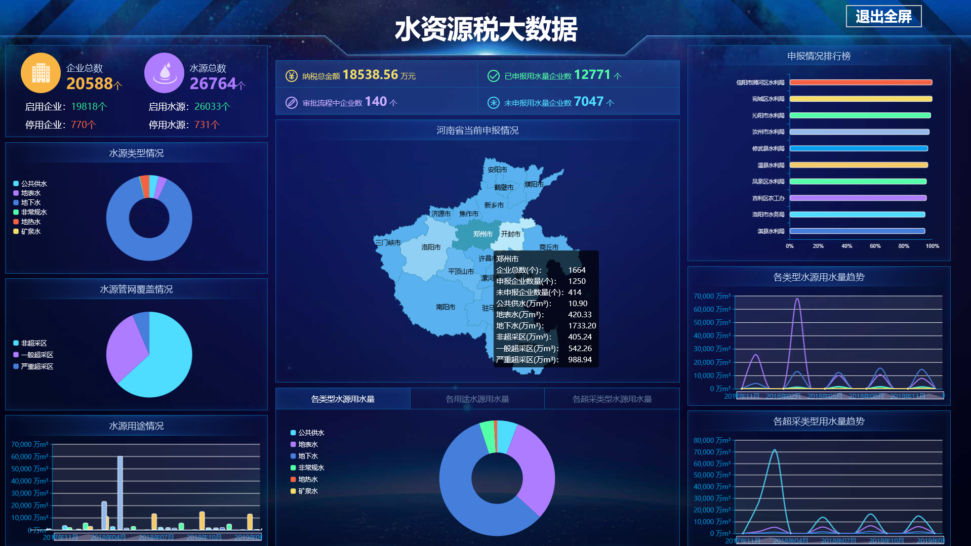 水资源税信息管理平台为全省的水利部门、税务部门、各取用水户提供统一平台,实现对水资源税和矿产资源税的征收管理。平台支持水利部门对企业信息、企业许可证信息、企业水源信息的管理;优化水量审批流程,实现水量核定书管理功能;完成取用水水量核定流程;完成水利、税务部门间的数据交换,为水利部门日常管理提供决策分析。