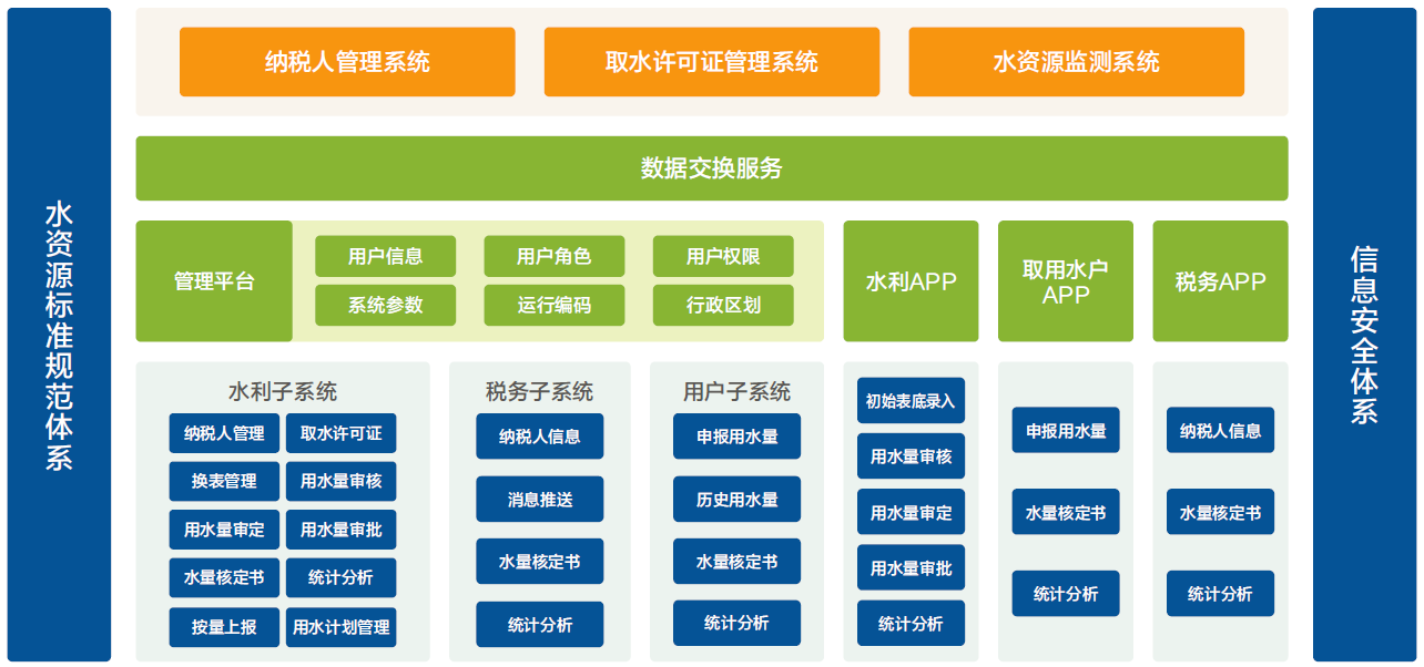 以水资源使用监测为基础,构建以取水、用水信息管理、业务应用、决策支持为核心的水资源税管理平台,建设节水型社会、缓解水资源供需矛盾、促进水资源有效利用、实现水资源优化配置。
