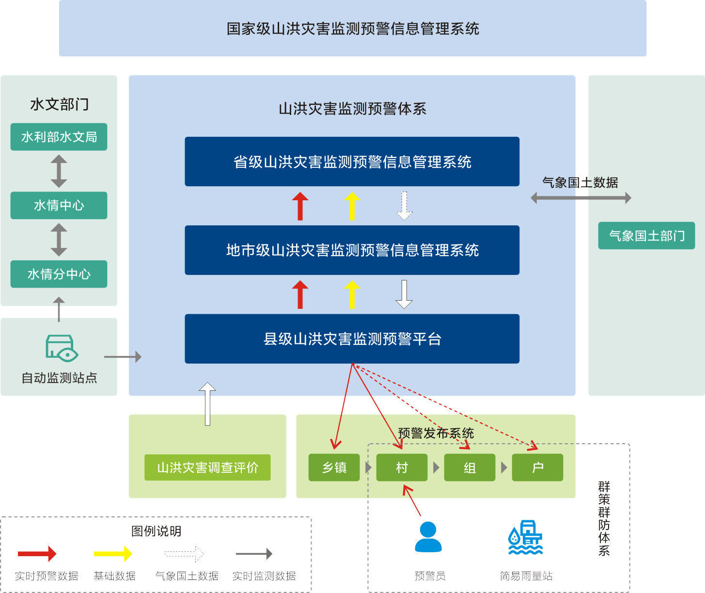 在易于发生洪涝灾害的区域建立以监测、通信、预报、预警等非工程性措施为主并与工程措施相结合的防灾减灾体系,减少群死群伤事件和财产损失。山洪灾害监测预警平台集信息采集、传输、分析和预警等多功能于一体,及时准确地上传下达预警信息,从而使可能受灾区域能够及时采取措施。