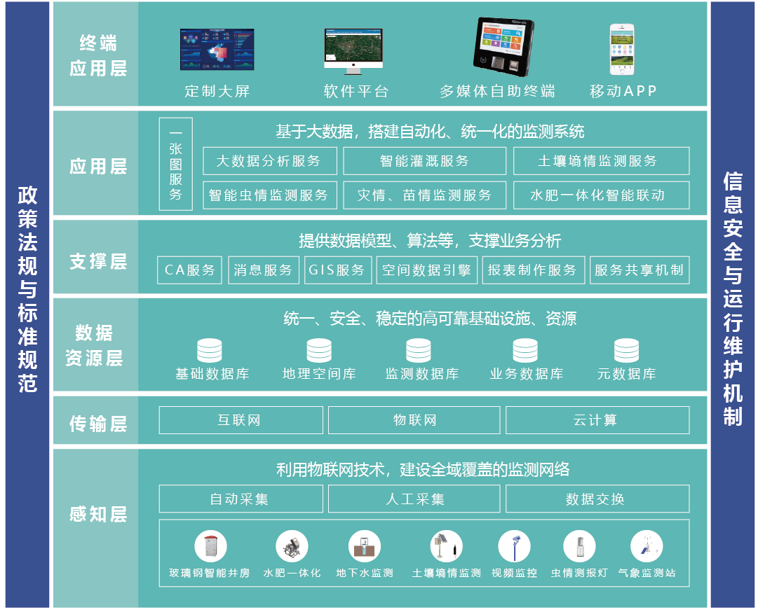 通过智能灌溉测控终端和智能灌溉APP,实时监控区域用水总量、用电总量,分析水资源利用状况,辅助制定节水措施,提高灌溉水利用率。平台支持多级用户管理模式,满足省、市、县、乡、村用水户多级业务管理需求;在水电双控功能基础上,实现了APP远程控制功能,可远程进行开关泵操作;可统一部署在云平台,各级部门分配账号,也可部署在客户机房服务器上,自行维护。