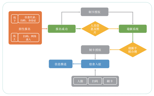 支持与身份证读卡器、摄像头、人脸识别等多种智能设备的融合,快速精准采集报名信息、快速办理迎新手续,体现学校管理规范化和信息化建设水平。支持与一卡通、闸机通道,水电、安防设备的融合;可实时掌握学生入住信息,动态监控公寓管理情况;加强学生住宿管理、规范公寓日常工作;实现信息共享,提高工作效率。